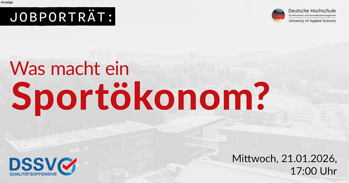Im nächsten Webinar der DHfPG-Reihe „Jobporträt – Was macht ein …?“ dreht sich am 21. Januar 2026 von 17 bis 18 Uhr alles um das Berufsbild der Sportökonomin und des Sportökonomen. Für wen ist das Studium geeignet? Wie sieht das Zusammenspiel zwischen Theorie und Praxis aus? Welche Karrierechancen warten auf Absolventinnen und Absolventen?